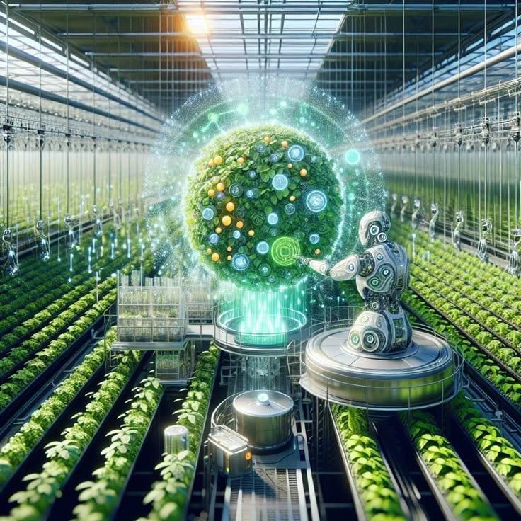 Future agriculture powered by vertical farming, hydroponics, AI-based crop monitoring, and sustainable food production technologies.